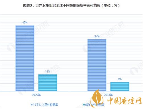 世界衛(wèi)生組織的報告指出,2000年以來全球男性和女性的吸煙率均有所降低,但吸煙人數(shù)仍在增長。具體來看,全球15歲以上的男性吸煙率從2000年的43%下滑到34%,而女性吸煙率則從2000年的11%下滑到6%。從吸煙人數(shù)的規(guī)模來看,目前全球共有11億成年煙民以及至少3.67億無煙煙草吸食者。此外,全球還有大約2400多萬名13歲-15歲的青少年吸食煙草,另有1300多萬名青少年使用無煙煙草制品。