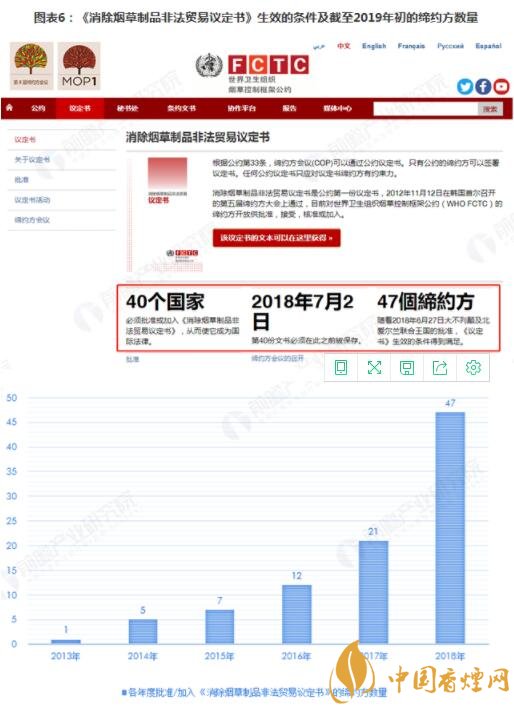 世界衛(wèi)生組織還積極推動《消除煙草制品非法貿(mào)易議定書》簽訂生效。按照2012年通過該議定書時的約定,《議定書》需要40個締約方可生效,《議定書》將在第40份文書被保存后第90天起生效。根據(jù)世界衛(wèi)生組織煙草控制框架公約發(fā)布的情況,隨著2018年6月27日大不列顛及北愛爾蘭聯(lián)合王國的批準(zhǔn),《議定書》生效的條件得到滿足。目前,議定書締約方數(shù)量已經(jīng)達(dá)到47個。