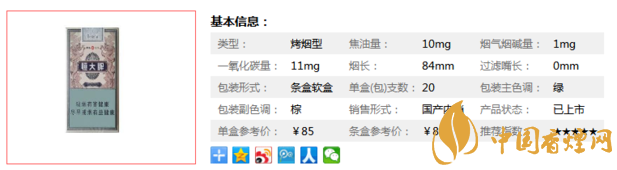 類型 :烤煙型 焦油量 :10mg 煙氣煙堿量 :1mg 一氧化碳量 :12mg