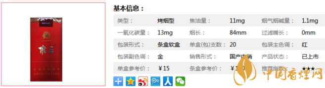 類型 :烤煙型 焦油量 :11mg 煙氣煙堿量 :1.1mg 一氧化碳量 :13mg