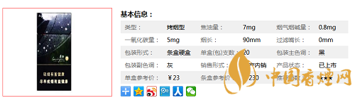 類型 :烤煙型 焦油量 :7mg 煙氣煙堿量 :0.8mg 一氧化碳量 :5mg