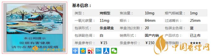 類型 :烤煙型 焦油量 :10mg 煙氣煙堿量 :1mg 一氧化碳量 :11mg