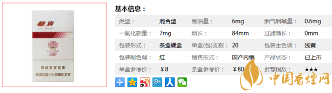 類型 :混合型 焦油量 :6mg 煙氣煙堿量 :0.6mg 一氧化碳量 :7mg