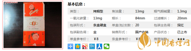 類型 :烤煙型 焦油量 :13mg 煙氣煙堿量 :1.3mg 一氧化碳量 :13mg