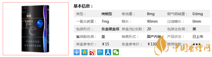類型 :烤煙型 焦油量 :8mg 煙氣煙堿量 :0.6mg 一氧化碳量 :7mg
