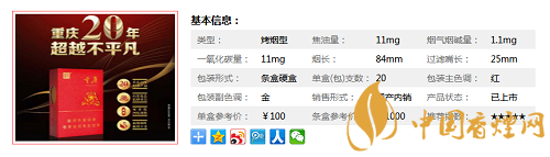 類型 :烤煙型 焦油量 :11mg 煙氣煙堿量 :1.1mg 一氧化碳量 :11mg