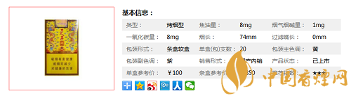 | 煙長:74mm | 過濾嘴長:25mm | 包裝形式:條盒軟盒 | 單盒(包)支數(shù):20 |