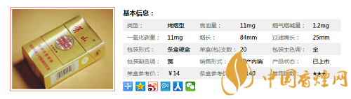 類型 :烤煙型 焦油量 :11mg 煙氣煙堿量 :1.2mg 一氧化碳量 :11mg