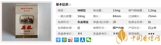 石林硬香煙,煙支長84mm,在開發(fā)過程中,經(jīng)與國外有實(shí)力的知名香料公司多次進(jìn)行合作研究,研發(fā)試驗(yàn)200多次,最賦予該產(chǎn)品獨(dú)特的加香加料風(fēng)格。下面我們一起來看石林硬的參數(shù)信息:焦油量:13mg 煙堿量:1.2mg 一氧化碳量:14mg.