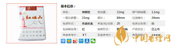 類型 :烤煙型 焦油量 :11mg 煙氣煙堿量 :1.1mg 一氧化碳量 :11mg
