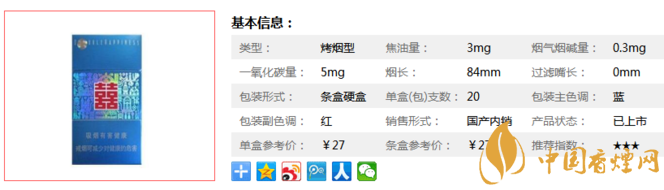類(lèi)型 :烤煙型 焦油量 :3mg 煙氣煙堿量 :0.3mg 一氧化碳量 :5mg