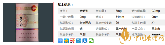 類型 :烤煙型 焦油量 :8mg 煙氣煙堿量 :0.9mg 一氧化碳量 :9mg
