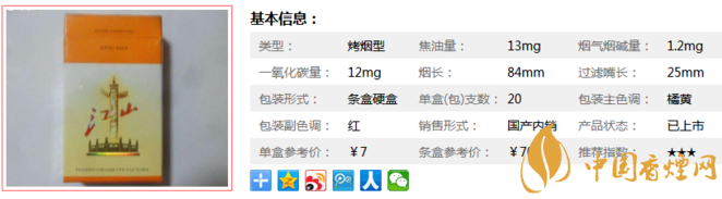“江山”牌低危害卷煙通過(guò)科學(xué)的配方手段;利用先進(jìn)的添加技術(shù),添加了大量的名貴中草藥提取液,每支煙中含有0.5%的“仙芪補(bǔ)腎顆粒”新型料液,它是由精選的淫羊藿、白芍、仙茅、黃芪、柴胡等多味中草藥嚴(yán)格按照現(xiàn)代制藥技術(shù)精練濃縮而成下面我們一起來(lái)看江山精品的參數(shù)信息:焦油量:13mg. 煙堿量:1.2mg. 一氧化碳量:12mg.