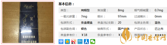 類型 :烤煙型 焦油量 :8mg 煙氣煙堿量 :0.7mg 一氧化碳量 :7mg