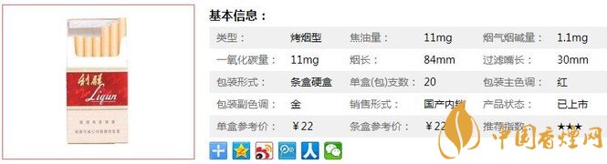 類型 :烤煙型 焦油量 :11mg 煙氣煙堿量 :1.1mg 一氧化碳量 :11mg