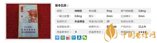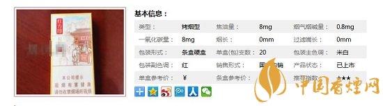 類型 :烤煙型 焦油量 :8mg 煙氣煙堿量 :0.8mg 一氧化碳量 :8mg