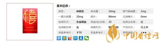 類型 :烤煙型 焦油量 :10mg 煙氣煙堿量 :1mg 一氧化碳量 :10mg
