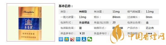 類型 :烤煙型 焦油量 :11mg 煙氣煙堿量 :1.1mg 一氧化碳量 :13mg