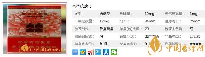 雙喜和喜煙支長84mm,過濾嘴長25mm,針對消費者口味特點構(gòu)建了新的研發(fā)平臺,綜合運用了調(diào)香最新技術(shù),進一步強化卷煙“甜、柔、順”的上乘品質(zhì)特點。下面我們一起來看雙喜和喜的參數(shù)信息:焦油量:10mg. 煙堿量:1mg. 一氧化碳量:12mg.