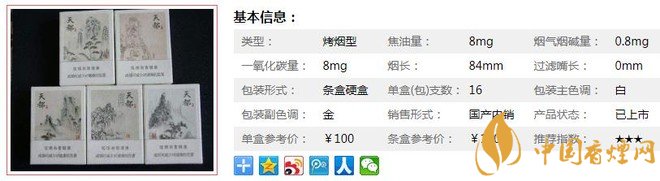 類型 :烤煙型 焦油量 :8mg 煙氣煙堿量 :0.8mg 一氧化碳量 :8mg