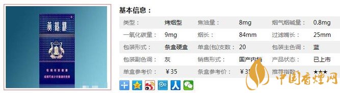 類型 :烤煙型 焦油量 :8mg 煙氣煙堿量 :0.8mg 一氧化碳量 :9mg