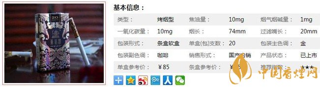 類型 :烤煙型 焦油量 :10mg 煙氣煙堿量 :1mg 一氧化碳量 :10mg