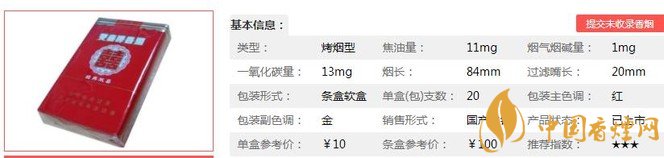 類型 :烤煙型 焦油量 :11mg 煙氣煙堿量 :1mg 一氧化碳量 :13mg