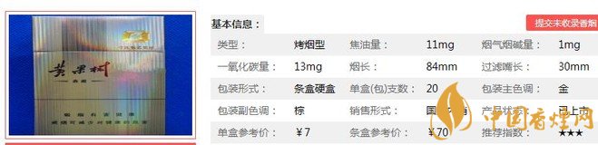 | 類型 :烤煙型 | 焦油量 :11mg | 煙氣煙堿量 :1mg | 一氧化碳量 :13mg |