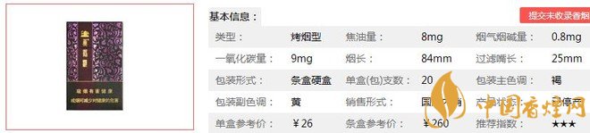 類型 :烤煙型 焦油量 :8mg 煙氣煙堿量 :0.8mg 一氧化碳量 :9mg