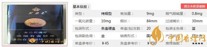 類型 :烤煙型 焦油量 :9mg 煙氣煙堿量 :0.8mg 一氧化碳量 :10mg
