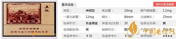 | 煙長(zhǎng):84mm | 過(guò)濾嘴長(zhǎng):25mm | 包裝形式:條盒硬盒 | 單盒(包)支數(shù):20 |