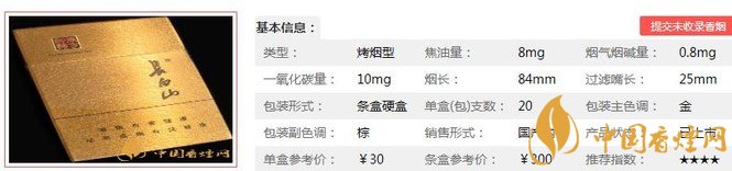 類型 :烤煙型 焦油量 :8mg 煙氣煙堿量 :0.8mg 一氧化碳量 :10mg