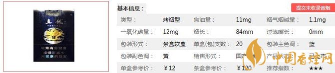 類(lèi)型 :烤煙型 焦油量 :11mg 煙氣煙堿量 :1.1mg 一氧化碳量 :12mg