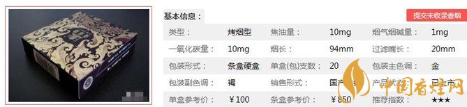 | 類型 :烤煙型 | 焦油量 :10mg | 煙氣煙堿量 :1mg | 一氧化碳量 :10mg |