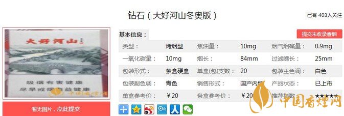 以上便是由香煙網(wǎng)小編為大家介紹的關(guān)于鉆石大好河山冬奧版價格及參數(shù) 獨家口感分析的相關(guān)信息,想要了解更多有關(guān)內(nèi)容請點擊:全球十大女士香煙品牌排行榜 精心整理全新首發(fā)