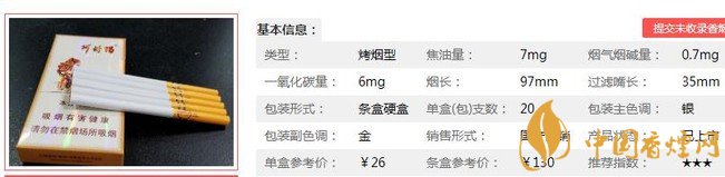 類型 :烤煙型 焦油量 :7mg 煙氣煙堿量 :0.7mg 一氧化碳量 :6mg