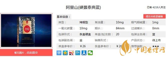 以上便是由香煙網(wǎng)小編為大家介紹的關(guān)于阿里山硬景泰典藍(lán)價(jià)格及參數(shù) 阿里山硬景泰典藍(lán)獨(dú)家口感分析的相關(guān)信息,想要了解更多有關(guān)內(nèi)容請(qǐng)點(diǎn)擊:鉆石硬藍(lán)新一代價(jià)格及參數(shù) 鉆石低檔位代表性香煙