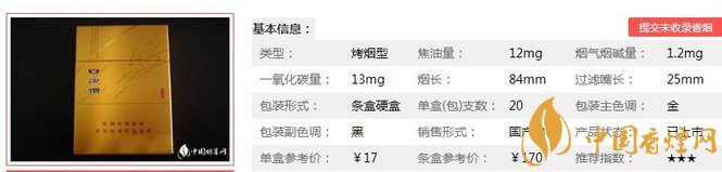 類(lèi)型 :烤煙型 焦油量 :8mg 煙氣煙堿量 :0.9mg 一氧化碳量 :10mg