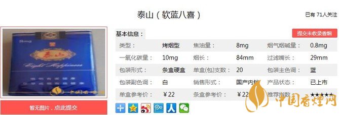 以上便是由香煙網小編為大家介紹的關于 泰山軟藍八喜價格和參數(shù) 泰山軟藍八喜口感分析的相關信息,想要了解更多有關內容請點擊:雙喜國喜軟藍口感測評 清爽醇雅甜潤怡然