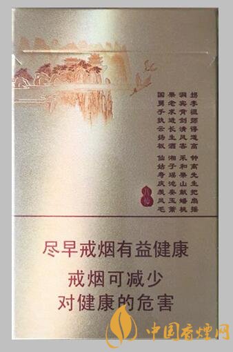 煙盒正面翻蓋處的八仙過海四字的設(shè)計,有些與金圣的滕王閣相似。主圖為騰云駕霧的老哥八個,應(yīng)該屬于線條畫的類型。警示語句為最新版本。整體為三段,最上段為燙金畫面,顏色與最下面部位相同。煙盒背面采用七言律詩的格式,簡介了八仙各自的特點。整體包裝十分有神韻。