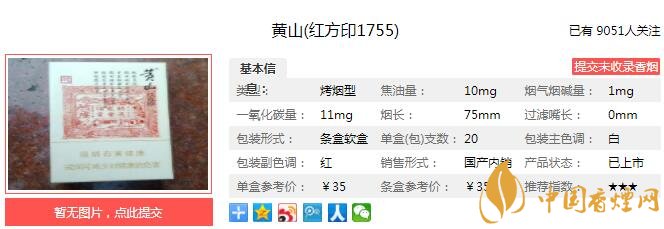 黃山紅方印1755煙支長74mm,過濾嘴長25mm,定位在短支煙品類。獨特側開包裝、特有保潤貼設計、創(chuàng)新易撕貼、破壞式條盒拆封防偽等諸多亮點成就“黃山”(紅方印1755)的鑒賞級品質。創(chuàng)新技術,人性化設計。下面我們一起來看黃山紅方印1755的參數(shù)信息:焦油量:10mg 煙堿量:0.9mg 一氧化碳量:11mg