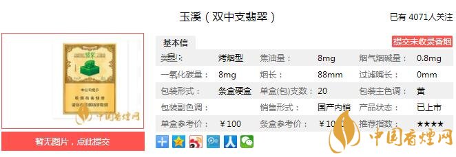 玉溪(翡翠)現(xiàn)有三款產(chǎn)品,各不相同:其一為翻蓋雙中支、無保濕帖、鏤空三截濾嘴、正式發(fā)售;其二為中支側(cè)開式、保濕貼、實心兩截濾嘴、圈層定制;其三為粗支天地蓋、保濕貼、鏤空三截濾嘴、私人定制。下面我們一起來看玉溪翡翠的參數(shù)信息:焦油量:8mg 煙堿量:0.8mg 一氧化碳量:8mg