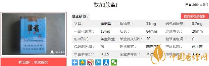 香煙上側(cè)的封標(biāo)印有河南中煙的字樣和LOGO ,內(nèi)襯紙為銀色。下側(cè)散花二字中間印有兩朵美麗的紅花。左側(cè)理化指標(biāo),右側(cè)條碼,都印有黃色花籃狀標(biāo)志。煙支7-6-7方式排列。黃色雪花濾嘴印有一粗一細(xì)兩道金色箍圈,煙支上印有花籃和花朵圖案,中間印有紅色散花漢字,將近占據(jù)煙支部分的二分之一。下面便是散花(軟藍(lán))的基本參數(shù):焦油量:11mg 煙堿量:0.7mg 一氧化碳量:13mg.
