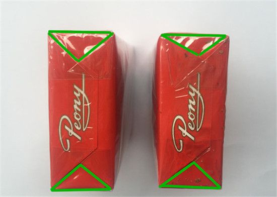牡丹香煙(軟)真假鑒別圖中可以發(fā)現(xiàn)真煙底部折痕形狀規(guī)則,為對稱的等腰三角形;而假煙的底部三角形折痕形狀不規(guī)則,而且不對稱。