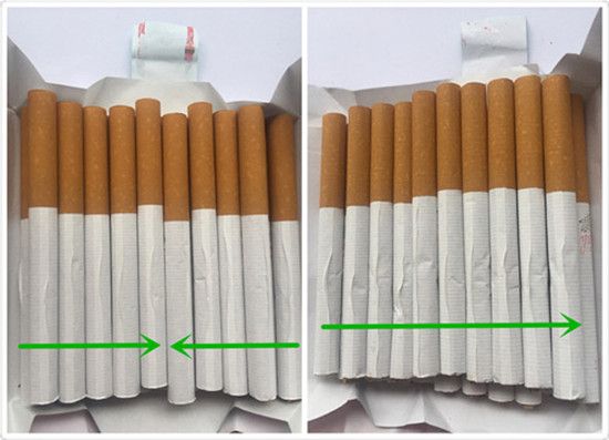牡丹香煙小盒真煙,同一包內(nèi)真煙煙支卷接紙有兩個相反的搭口方向;而假煙煙支卷接紙搭口方向?yàn)橥粋€。