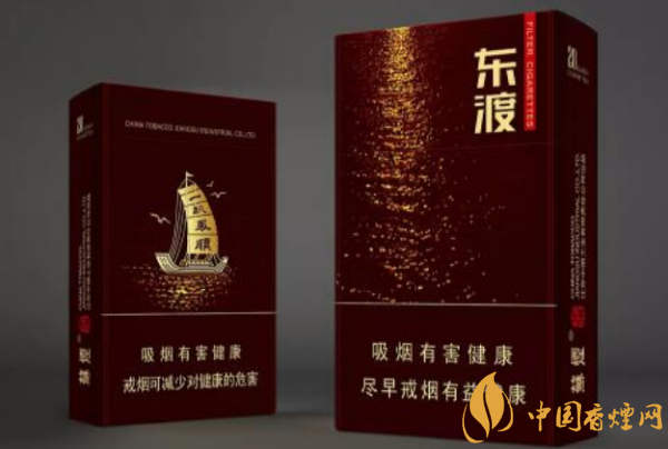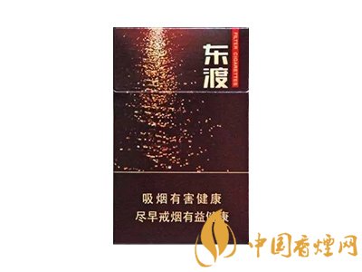 盒子正面翻蓋右側有金色豎排的“東渡”品名,過濾嘴香煙的英文filter cigarette列于其旁,主圖案除了品名外就是稍稍靠左的日暉圖案,像朝陽斜映在波光粼粼的水面,反射出點點金光,顯得非常有意境;
