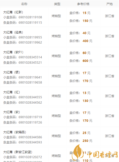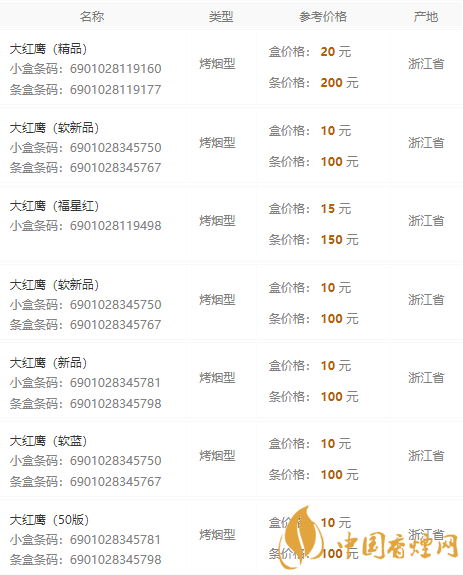 以上就是香煙網(wǎng)為您提供的2020大紅鷹香煙價格表和圖片信息,想要了解更多的相關(guān)知識,請來關(guān)注香煙網(wǎng)!