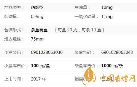 類(lèi)型 :烤煙型 焦油量 :10mg 煙氣煙堿量 :0.9mg 一氧化碳量 :11mg