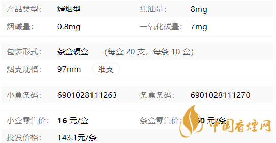 | 類型 :烤煙型 | 焦油量 :8mg | 煙氣煙堿量 :0.8mg | 一氧化碳量 :7mg |