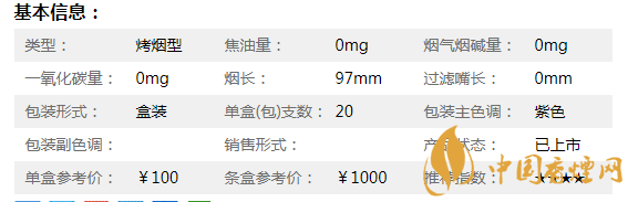 類型 :烤煙型 焦油量 :6mg 煙氣煙堿量 :0.6mg 一氧化碳量 :6mg